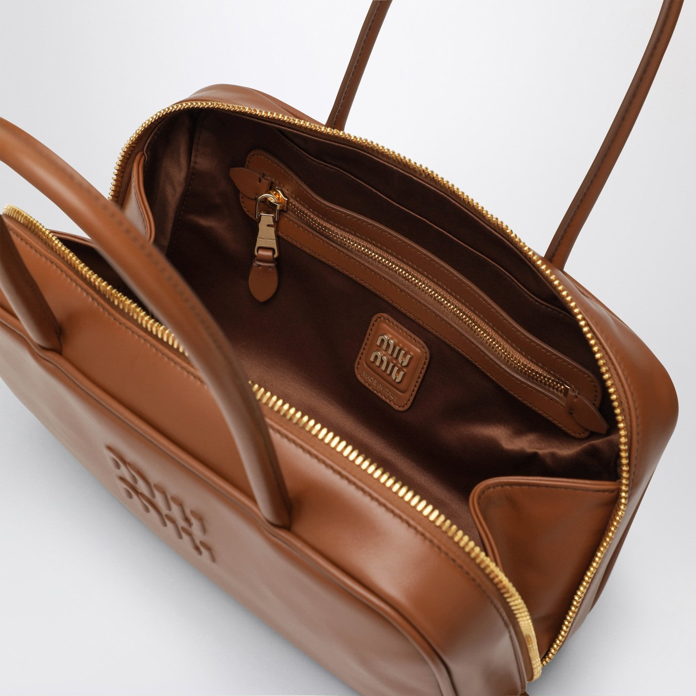 Medium Miu Miu bag in Cognac leather, featuring embossed logo lettering on the front, gold-tone metal hardware, two handles with strap detail, double zip closure, cotton satin lining, and one flat inner zip pocket.