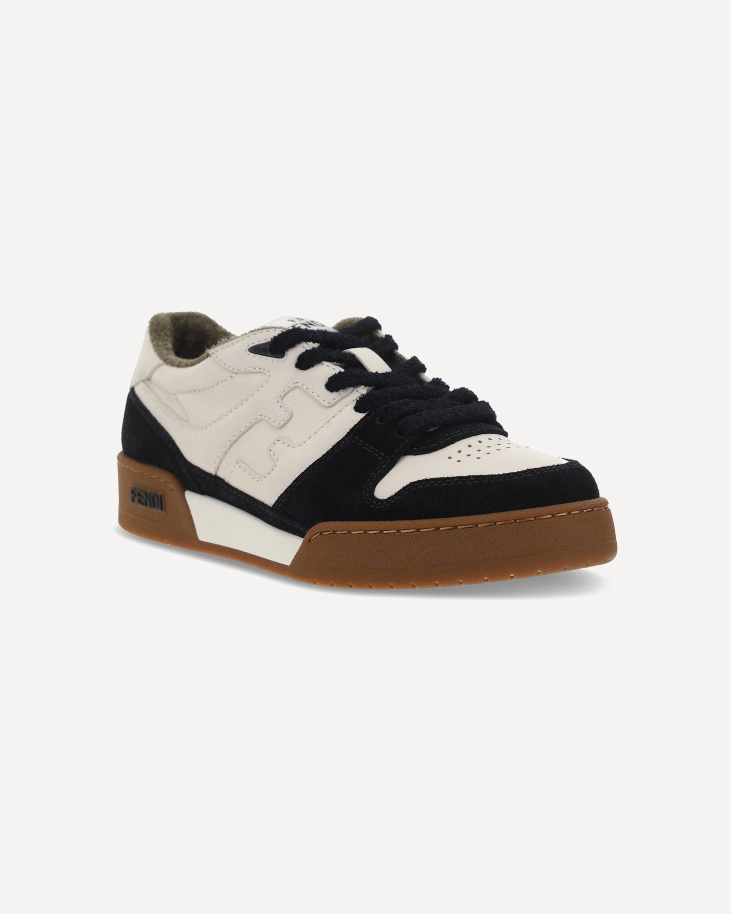 Calfskin Match Low Sneakers by Fendi featuring lace-up front closure, paneled design with suede inserts, iconic brand FF logo on embossed side panels, perforated round toe, iconic brand signature patch embroidered on front tongue, flat sole, embossed brand signature on outer side sole.