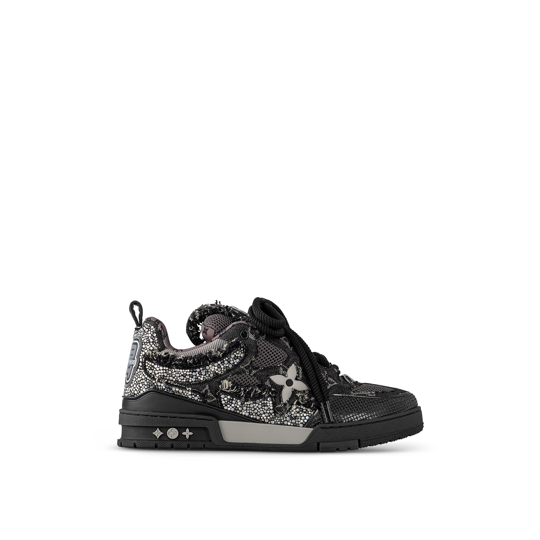 This exceptional edition of the LV Skate sneaker combines Monogram denim with sparkling Swarovski™ crystals and technical mesh. This Nineties-inspired design is characterized by its padded collar and tongue, which features an LV since 54 logo, referring to 1854, when Louis Vuitton was founded. Technical double laces and a bicolor rubber outsole complete this model.