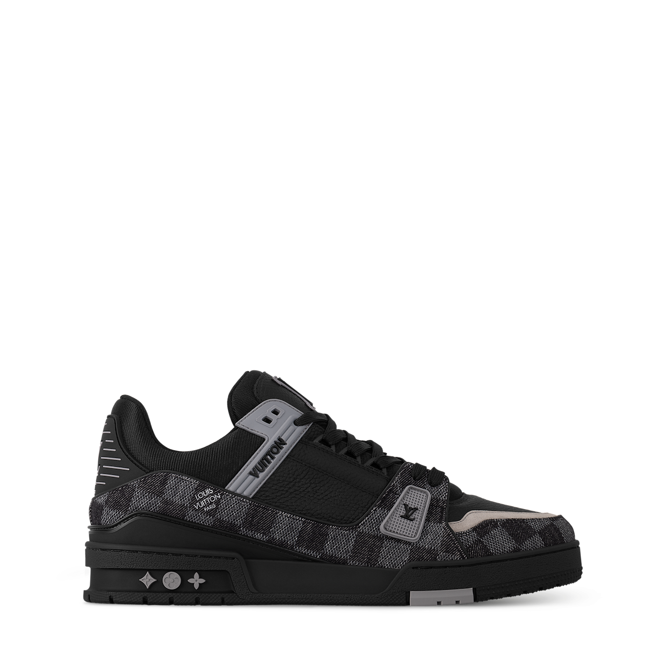 This edition of the LV Trainer sneaker pairs Damier denim with smooth calf leather. The combination of materials highlights this model's elaborately constructed upper. Rubber signatures and a technical rubber outsole complete this cult design, which was originally created by Virgil Abloh.